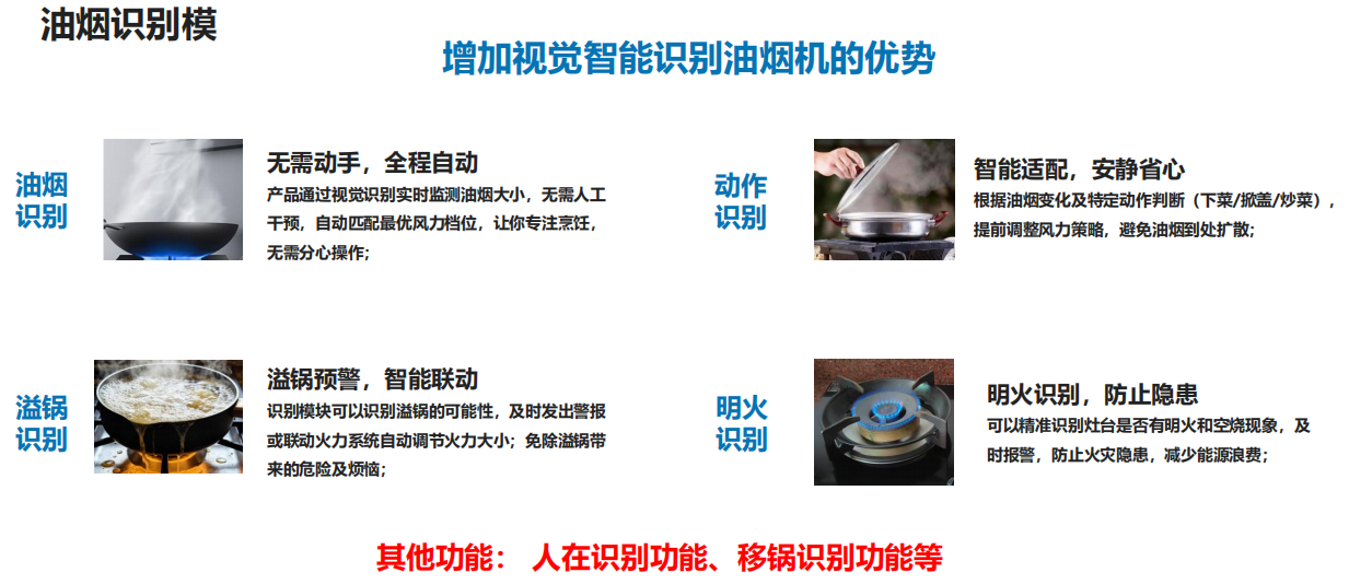 增加视觉智能识别油烟机的优势:油烟识别、下菜/掀盖等动作识别、溢锅识别、明火识别、人在识别、移锅识别。
